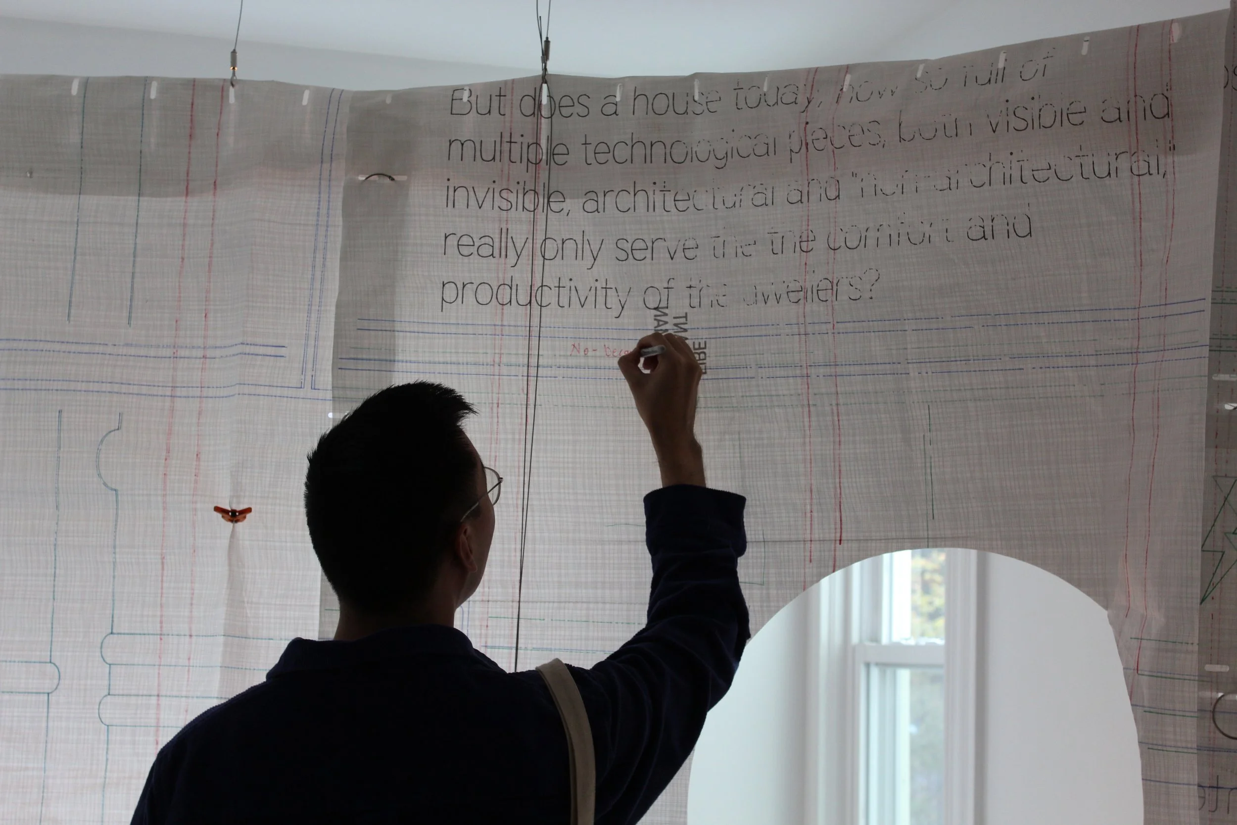 In MR NULLUS challenges workflow and method in the authorship of design when the final product appears as a compilation of linear experiences, when in fact its origin was an assemblage of visual ‘databases’ collected at various times and composed atemporally as a temporal artifact. While WEIGHT OF COMFORT politicizes the mirage of construction through the materiality of reclaimed textiles from the renovations of Gund Hall to underscore the invisibilized labor and capital expended to provide interior comfort and curb energy use.